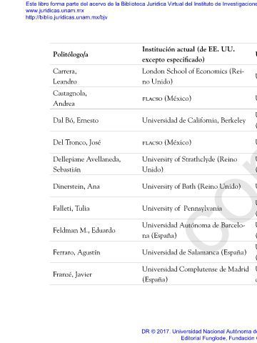 www.juridicas.unam.mx http://biblio.juridicas.unam.mx/bjv Politólogo/a Carrera, Leandro Castagnola, Andrea Dal Bó, Ernesto Del Tronco, José Dellepiane Avellaneda, Sebastián Dinerstein, Ana Falleti, Tulia Feldman M., Eduardo Ferraro, Agustín Franzé, Javier