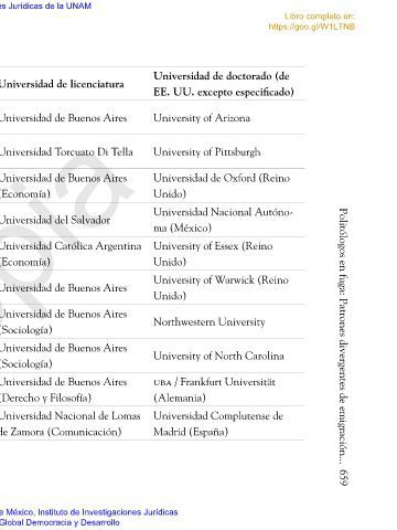 Universidad de doctorado (de ee. UU. excepto especificado) University of Arizona University of Pittsburgh Universidad de Oxford (Reino Unido) Universidad Nacional Autóno- ma (México) University of Essex (Reino Unido) University of Warwick (Reino Unido) Northwestern University University of North Carolina uba / F