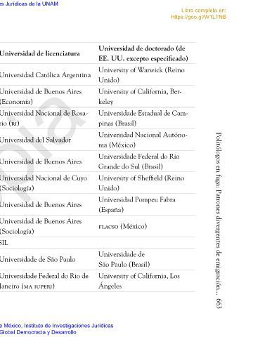Universidad de doctorado (de ee. UU. excepto especificado) University of Warwick (Reino Unido) University of California, Ber- keley Universidade Estadual de Cam- pinas (Brasil) Universidad Nacional Autóno- ma (México) Universidade Federal do Rio Grande do Sul (Brasil) University of Sheffield (Reino Unido) Univers