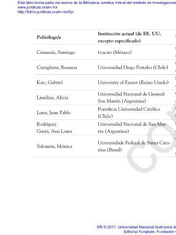www.juridicas.unam.mx http://biblio.juridicas.unam.mx/bjv Politólogo/a Carassale, Santiago Castiglioni, Rossana Katz, Gabriel Lissidini, Alicia Luna, Juan Pablo Rodríguez Gustá, Ana Laura Salomón, Mónica