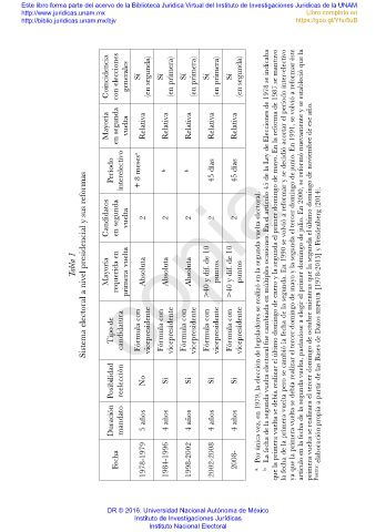 Tabla 1 Sistema electoral a nivel presidencial y sus reformas Mayoría requerida en reeleccióncopia puntos >40 y dif. de 10 puntos La fecha de la segunda vuelta electoral fue cambiada en múltiples ocasiones. En el artículo 45 de la Ley de Elecciones de 1978 se indicaba que la primera vuelta se debía realizar el último domingo de enero y