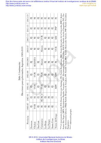 Tabla 5 (continuación) Elecciones para gobernador, Argentina 1983-2019 1999-2003 1995-99 PJ PJ PJcopia Nota: if: intervención federal; FCS: Frente Cívico por Santiago; FR: Fuerza Republicana; FRC: Frente Renovador de la Concordia; JSRN: Juntos Somos Río Negro; MPN: Movimiento Popular Neuquino; MPF: Movimiento Popular Fueguino; PACH: Part