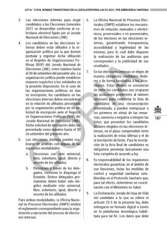 LEY N.° 31038, NORMAS TRANSITORIAS EN LA LEGISLACIÓN PARA LAS EG 2021, POR EMERGENCIA SANITARIA