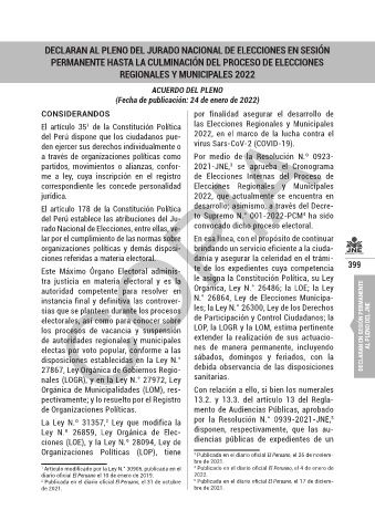 los procesos de vacancia y suspensión LOP, la LOGR y la LOM, estima pertinente DECLARAN EN SESIÓN PERMANENTE AL PLENO DEL JNE