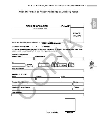 RES. N.° 0325-2019-JNE, REGLAMENTO DEL REGISTRO DE ORGANIZACIONES POLÍTICAS Anexo 10: Formato de Ficha de Afiliación para Comités y Padrón REGLAMENTO DEL ROP COPIA 453