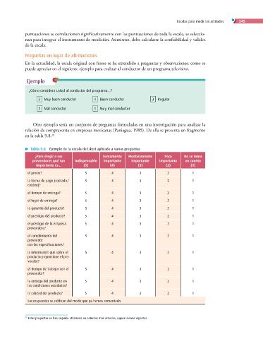 Tabla 9.8 Ejemplo de la escala de Likert aplicada a varias preguntas