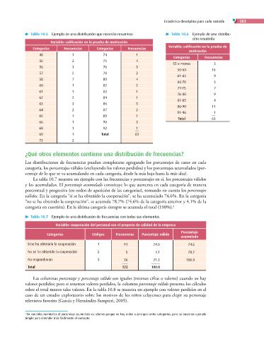 La tabla 10.7 muestra un ejemplo con las frecuencias y porcentajes en sí, los porcentajes válidos