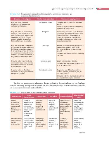 Tabla 15.1 Preguntas de investigación cualitativas, diseños cualitativos e información que
