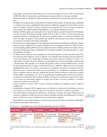 Tabla 16.1 Características del reporte cualitativo dependiendo del tipo de diseño